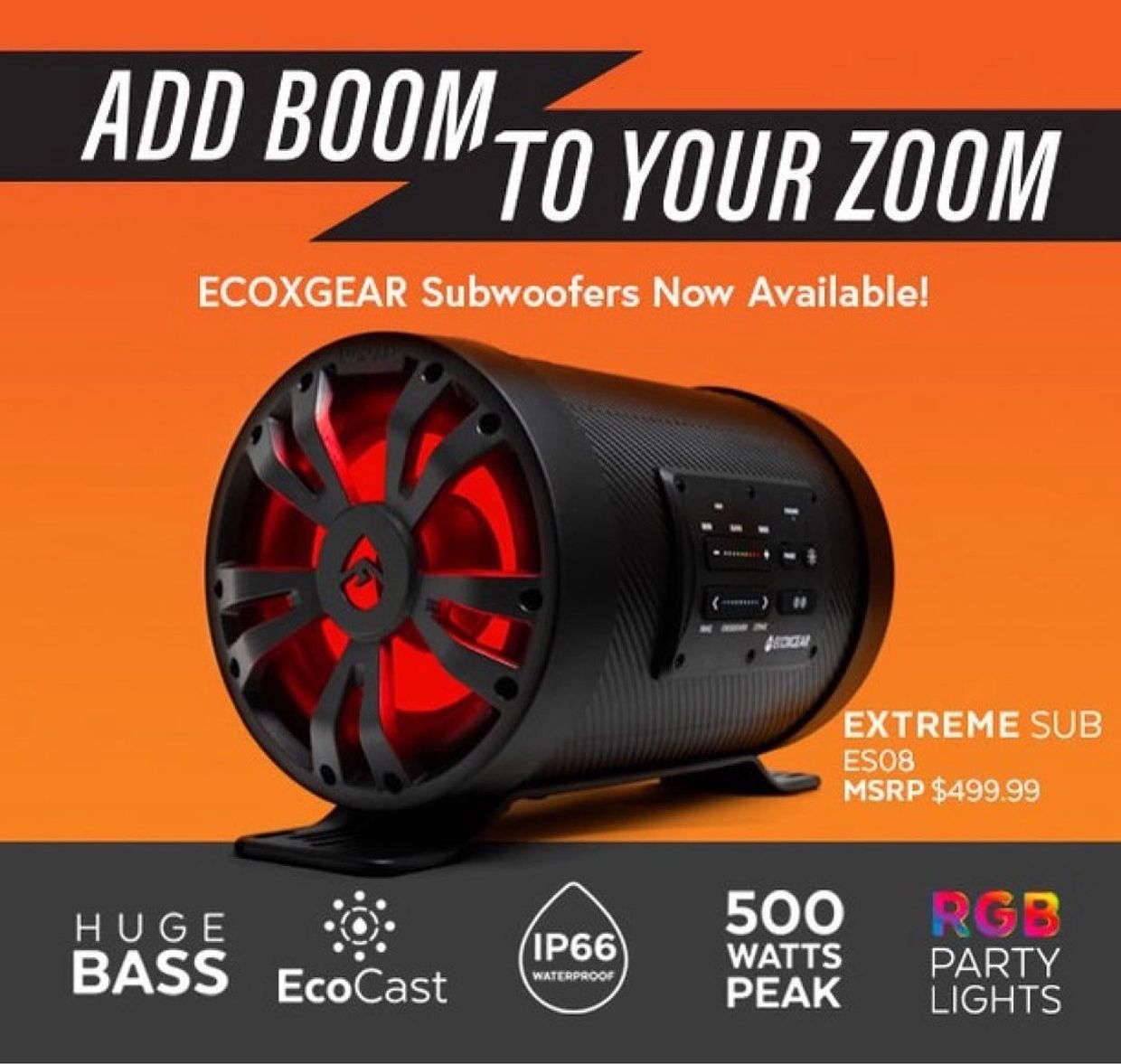 Turn up the volume with an ECOXGEAR Powersports Amplified Soundbar! Multi-color reactive lights, great sound quality, and an option between a rechargeable battery or an external 12VDC power supply make these Soundbars a great upgrade for the recreational vehicle of choice. Join the party with Ecocast speakers that can link up to 100 speakers together! Find ECOXGEAR products at EVI.